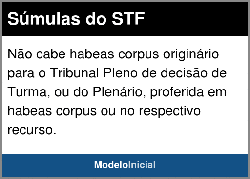 STF - Súmula 606: Não cabe habeas corpus originário para o Tribunal Pleno de decisão de Turma, ou do Plenário, proferida em habeas corpus ou no respectivo recurso.