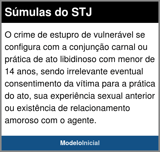 1. Nos termos da Súmula n. 593 desta Corte, "[o] crime de estupro de vulnerável se configura com a conjunção carnal ou prática de ato libidinoso com menor de 14 anos, sendo irrelevante eventual consentimento da vítima para a prática do ato, sua experiência sexual anterior ou existência de relacionamento amoroso com o agente".
