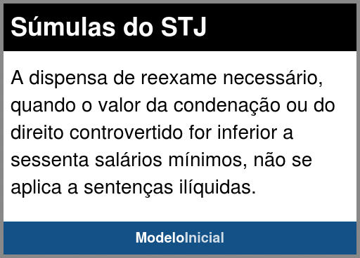 A dispensa de reexame necessário, quando o valor da condenação ou do direito controvertido for inferior a sessenta salários mínimos, não se aplica a sentenças ilíquidas.Súmula 490 do STJ