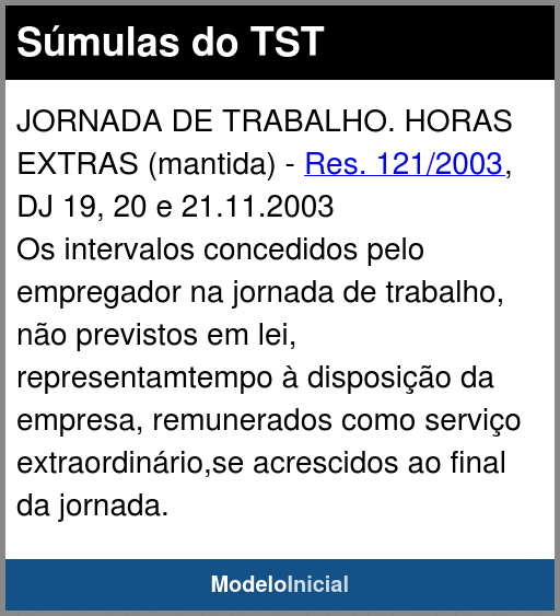 JORNADA DE TRABALHO. HORAS EXTRAS (mantida) - Res. 121/2003, DJ 19, 20 e 21.11.2003Os intervalos concedidos pelo empregador na jornada de trabalho, não previstos em lei, representamtempo à disposição da empresa, remunerados como serviço extraordinário,se acrescidos ao final da jornada.