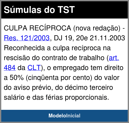 CULPA RECÍPROCA (nova redação) - Res. 121/2003, DJ 19, 20e 21.11.2003Reconhecida a culpa recíproca na rescisão do contrato de trabalho (art. 484 da CLT), o empregado tem direito a 50% (cinqüenta por cento) do valor do aviso prévio, do décimo terceiro salário e das férias proporcionais.