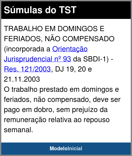 TRABALHO EM DOMINGOS E FERIADOS, NÃO COMPENSADO (incorporada a Orientação Jurisprudencial nº 93 da SBDI-1) - Res. 121/2003, DJ 19, 20 e 21.11.2003O trabalho prestado em domingos e feriados, não compensado, deve ser pago em dobro, sem prejuízo da remuneração relativa ao repouso semanal.