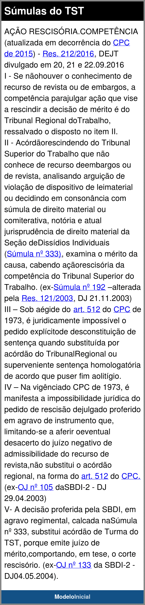 II - Acórdãorescindendo do Tribunal Superior do Trabalho que não conhece de recurso deembargos ou de revista, analisando arguição de violação de dispositivo de leimaterial ou decidindo em consonância com súmula de direito material ou comiterativa, notória e atual jurisprudência de direito material da Seção deDissídios Individuais (Súmula nº 333), examina o mérito da causa, cabendo açãorescisória da competência do Tribunal Superior do Trabalho. (ex-Súmula nº 192 –alterada pela Res. 121/2003, DJ 21.11.2003)