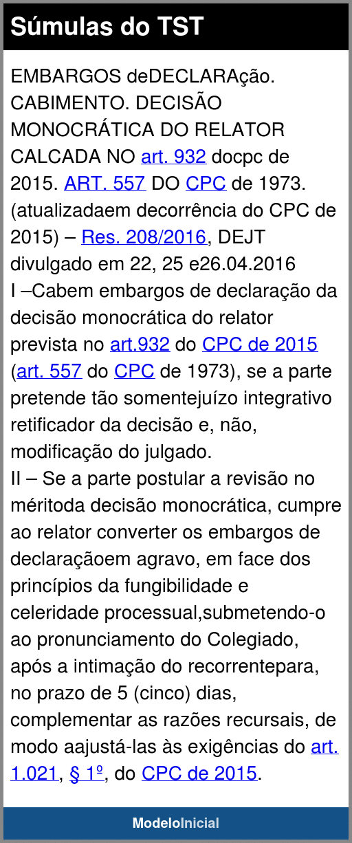 EMBARGOS deDECLARAção. CABIMENTO. DECISÃO MONOCRÁTICA DO RELATOR CALCADA NO art. 932 docpc de 2015. ART. 557 DO CPC de 1973. (atualizadaem decorrência do CPC de 2015) – Res. 208/2016, DEJT divulgado em 22, 25 e26.04.2016I –Cabem embargos de declaração da decisão monocrática do relator prevista no art.932 do CPC de 2015 (art. 557 do CPC de 1973), se a parte pretende tão somentejuízo integrativo retificador da decisão e, não, modificação do julgado.