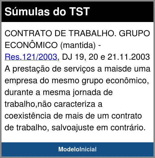 CONTRATO DE TRABALHO. GRUPO ECONÔMICO (mantida) - Res.121/2003, DJ 19, 20 e 21.11.2003A prestação de serviços a maisde uma empresa do mesmo grupo econômico, durante a mesma jornada de trabalho,não caracteriza a coexistência de mais de um contrato de trabalho, salvoajuste em contrário.
