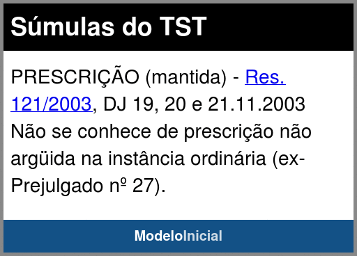 PRESCRIÇÃO (mantida) - Res. 121/2003, DJ 19, 20 e 21.11.2003Não se conhece de prescrição não argüida na instância ordinária (ex-Prejulgado nº 27).