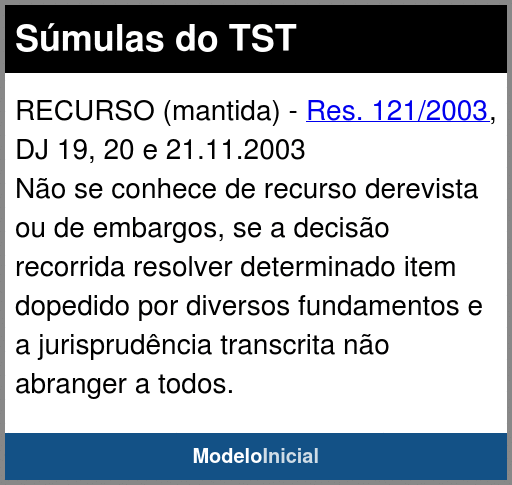 RECURSO (mantida) - Res. 121/2003, DJ 19, 20 e 21.11.2003Não se conhece de recurso derevista ou de embargos, se a decisão recorrida resolver determinado item dopedido por diversos fundamentos e a jurisprudência transcrita não abranger a todos.