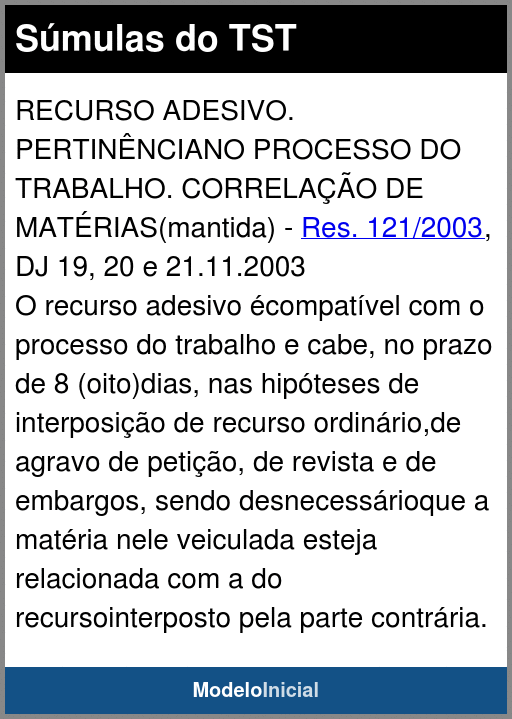 RECURSO ADESIVO. PERTINÊNCIANO PROCESSO DO TRABALHO. CORRELAÇÃO DE MATÉRIAS(mantida) - Res. 121/2003, DJ 19, 20 e 21.11.2003O recurso adesivo écompatível com o processo do trabalho e cabe, no prazo de 8 (oito)dias, nas hipóteses de interposição de recurso ordinário,de agravo de petição, de revista e de embargos, sendo desnecessárioque a matéria nele veiculada esteja relacionada com a do recursointerposto pela parte contrária.