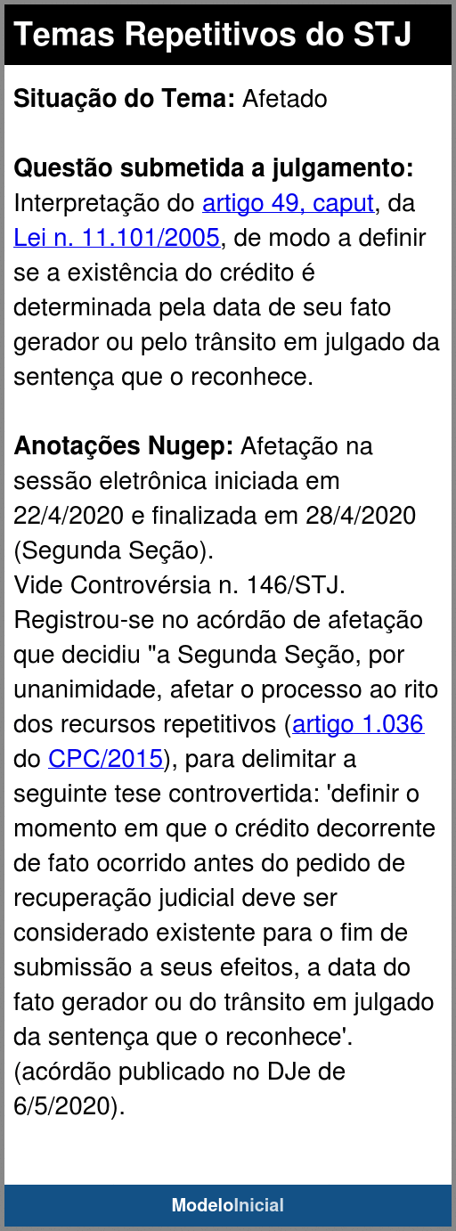 Registrou-se no acórdão de afetação que decidiu "a Segunda Seção, por unanimidade, afetar o processo ao rito dos recursos repetitivos (artigo 1.036 do CPC/2015), para delimitar a seguinte tese controvertida: 'definir o momento em que o crédito decorrente de fato ocorrido antes do pedido de recuperação judicial deve ser considerado existente para o fim de submissão a seus efeitos, a data do fato gerador ou do trânsito em julgado da sentença que o reconhece'. (acórdão publicado no DJe de 6/5/2020).
