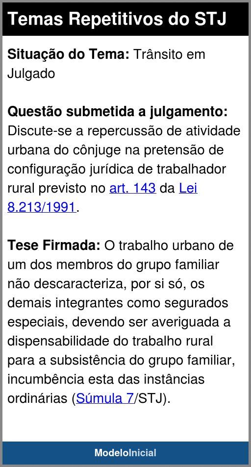 Situação do Tema: Trânsito em JulgadoQuestão submetida a julgamento: Discute-se a repercussão de atividade urbana do cônjuge na pretensão de configuração jurídica de trabalhador rural previsto no art. 143 da Lei 8.213/1991.