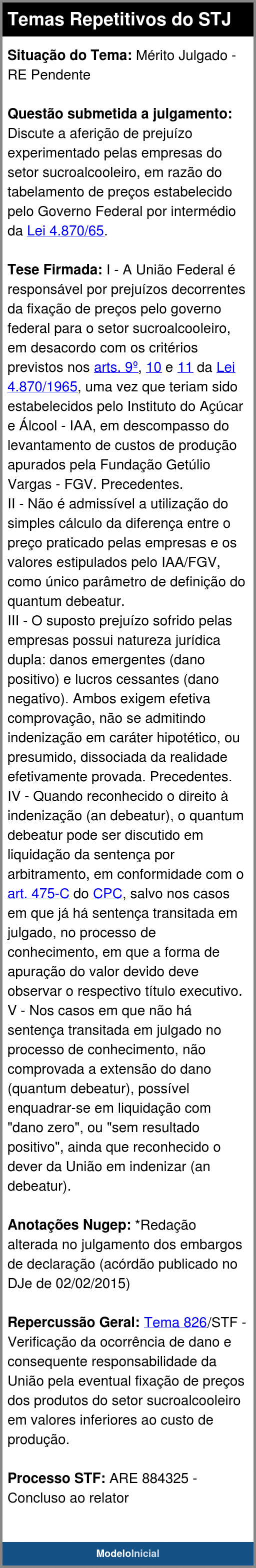 Tese Firmada: I - A União Federal é responsável por prejuízos decorrentes da fixação de preços pelo governo federal para o setor sucroalcooleiro, em desacordo com os critérios previstos nos arts. 9º, 10 e 11 da Lei 4.870/1965, uma vez que teriam sido estabelecidos pelo Instituto do Açúcar e Álcool - IAA, em descompasso do levantamento de custos de produção apurados pela Fundação Getúlio Vargas - FGV. Precedentes.