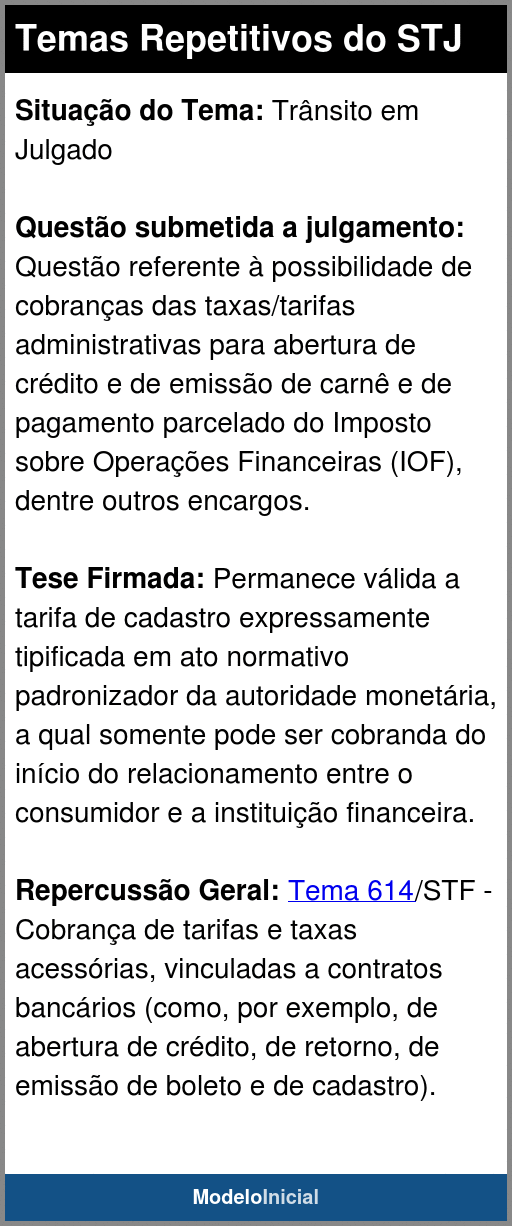 Repercussão Geral: Tema 614/STF - Cobrança de tarifas e taxas acessórias, vinculadas a contratos bancários (como, por exemplo, ?de abertura de crédito?, ?de retorno?, ?de emissão de boleto? e ?de cadastro?).