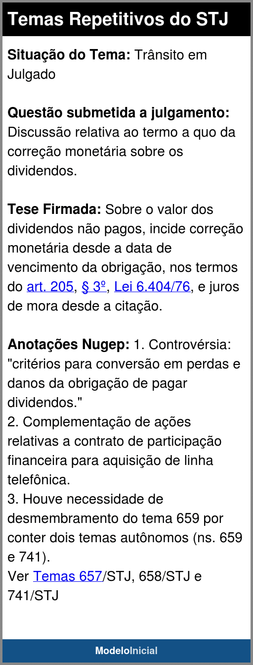 Situação do Tema: Trânsito em JulgadoQuestão submetida a julgamento: Discussão relativa ao termo a quo da correção monetária sobre os dividendos.
