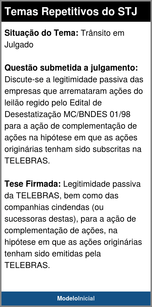 Tese Firmada: Legitimidade passiva da TELEBRAS, bem como das companhias cindendas (ou sucessoras destas), para a ação de complementação de ações, na hipótese em que as ações originárias tenham sido emitidas pela TELEBRAS.