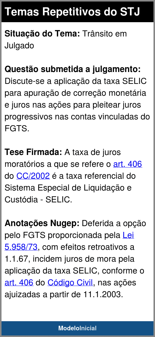 Situação: Trânsito em JulgadoQuestão submetida a julgamento: Discute-se a aplicação da taxa SELIC para apuração de correção monetária e juros nas ações para pleitear juros progressivos nas contas vinculadas do FGTS.