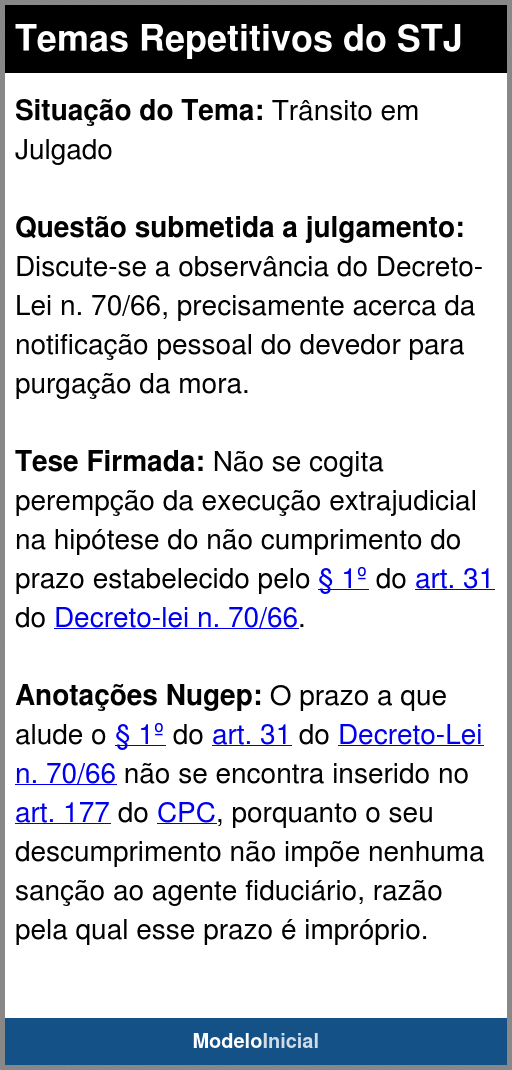 Tese Firmada: Não se cogita perempção da execução extrajudicial na hipótese do não cumprimento do prazo estabelecido pelo § 1º do art. 31 do Decreto-lei n. 70/66.