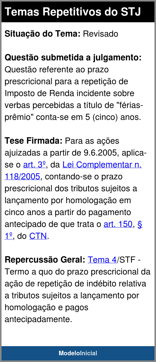 Situação: RevisadoQuestão submetida a julgamento: Questão referente ao prazo prescricional para a repetição de Imposto de Renda incidente sobre verbas percebidas a título de "férias-prêmio" conta-se em 5 (cinco) anos.