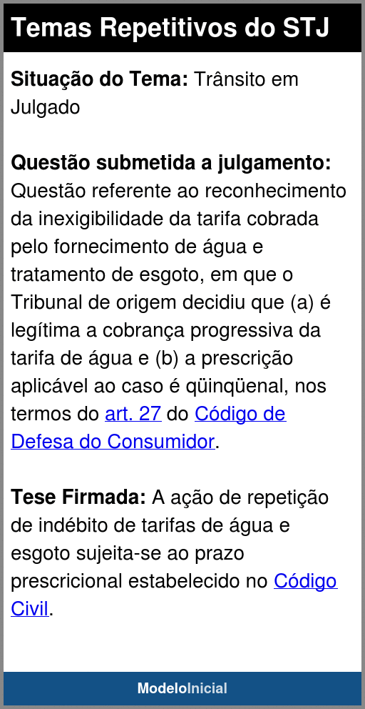 Situação: Trânsito em JulgadoQuestão submetida a julgamento: Questão referente ao reconhecimento da inexigibilidade da tarifa cobrada pelo fornecimento de água e tratamento de esgoto, em que o Tribunal de origem decidiu que (a) é legítima a cobrança progressiva da tarifa de água e (b) a prescrição aplicável ao caso é qüinqüenal, nos termos do art. 27 do Código de Defesa do Consumidor.