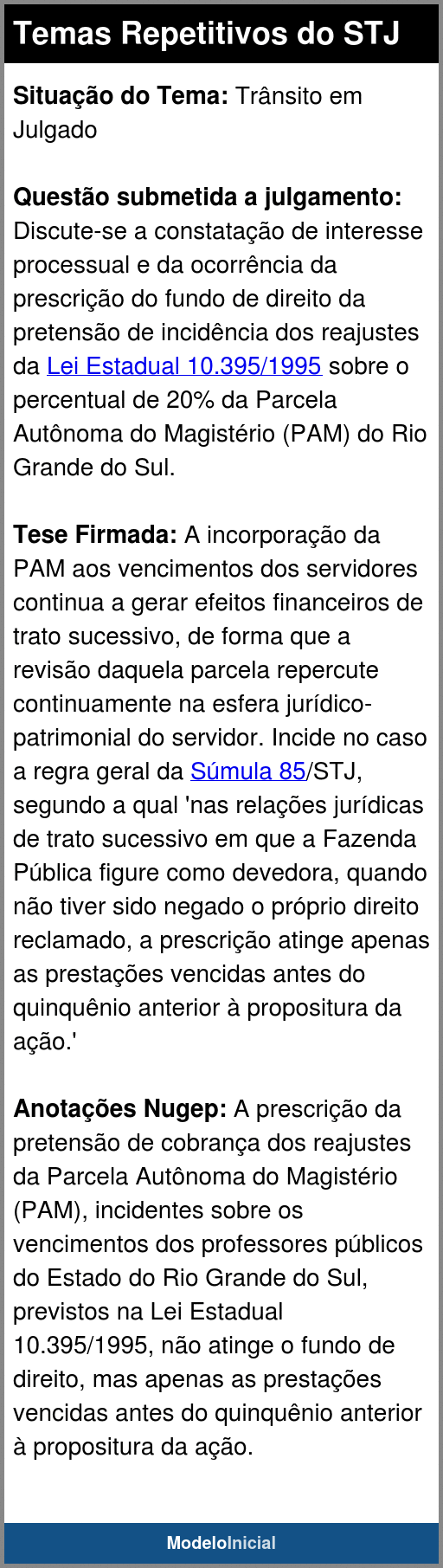 Situação: Trânsito em JulgadoQuestão submetida a julgamento: Discute-se a constatação de interesse processual e da ocorrência da prescrição do fundo de direito da pretensão de incidência dos reajustes da Lei Estadual 10.395/1995 sobre o percentual de 20% da Parcela Autônoma do Magistério (PAM) do Rio Grande do Sul.