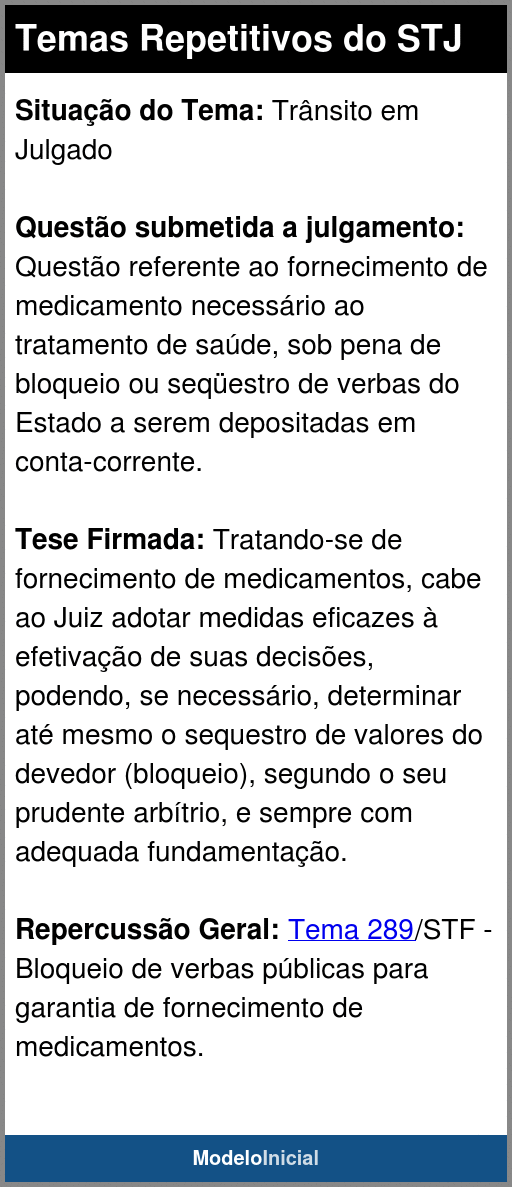 Repercussão Geral: Tema 289/STF - Bloqueio de verbas públicas para garantia de fornecimento de medicamentos.