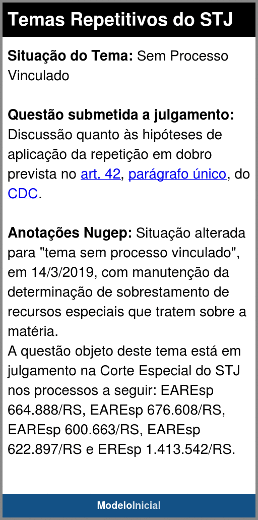 Situação: Em JulgamentoQuestão submetida a julgamento: Discussão quanto às hipóteses de aplicação da repetição em dobro prevista no art. 42, parágrafo único, do CDC.