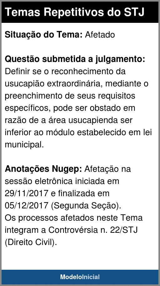 Situação: Trânsito em JulgadoQuestão submetida a julgamento: Definir se o reconhecimento da usucapião extraordinária, mediante o preenchimento de seus requisitos específicos, pode ser obstado em razão de a área usucapienda ser inferior ao módulo estabelecido em lei municipal.