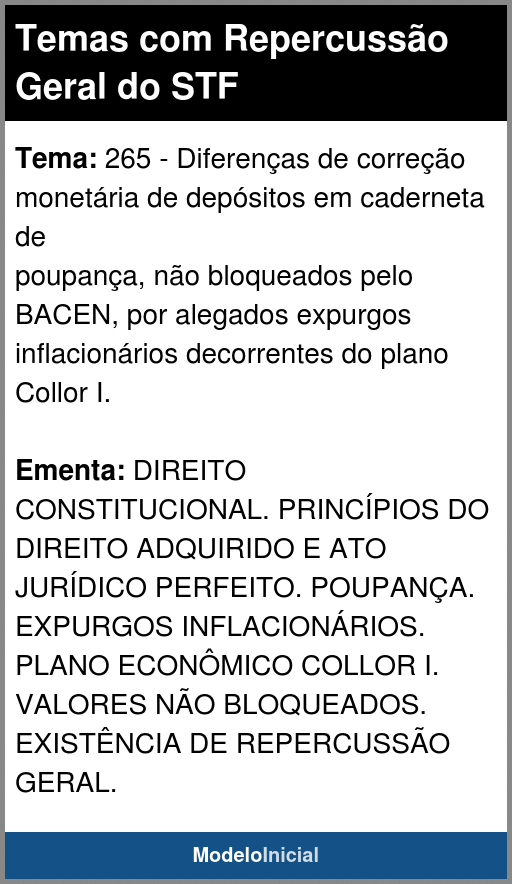 Tema 265: Diferenças de correção monetária de depósitos em caderneta de poupança, não bloqueados pelo BACEN, por alegados expurgos inflacionários decorrentes do plano Collor I.Descrição: Agravo de instrumento interposto contra decisão que inadmitiu recurso extraordinário em que se discute, à luz do art. 5º, XXXVI, da Constituição Federal, o direito, ou não, a diferenças de correção monetária de depósitos em cadernetas de poupança, por alegados expurgos inflacionários decorrentes do plano econômico denominado Collor I.