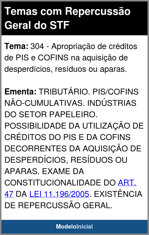 Tema 304: Apropriação de créditos de PIS e COFINS na aquisição de desperdícios, resíduos ou aparas.Descrição: Recurso extraordinário em que se discute, à luz dos artigos 170, IV, VI e VIII; e 225, da Constituição Federal, a possibilidade, ou não, de serem apropriados os créditos de PIS e COFINS na aquisição de desperdícios, resíduos ou aparas.