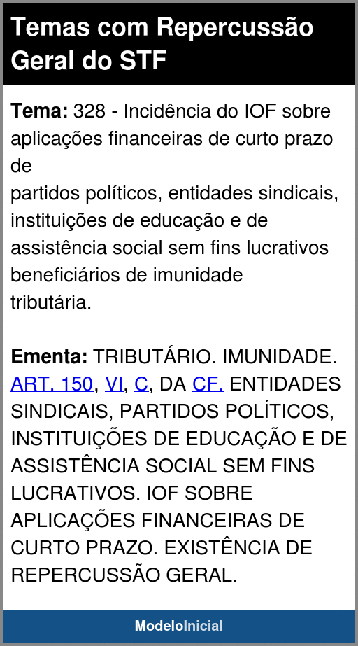 Tema 328: Incidência do IOF sobre aplicações financeiras de curto prazo de partidos políticos, entidades sindicais, instituições de educação e de assistência social sem fins lucrativos beneficiários de imunidade tributária.