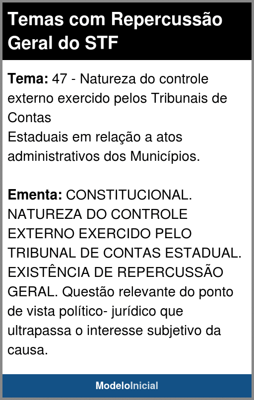 Tema 47: Natureza do controle externo exercido pelos Tribunais de Contas Estaduais em relação a atos administrativos dos Municípios.Descrição: Recurso Extraordinário em que se discute, à luz dos artigos 31, § 1º; 37, caput e I; 71, III, da Constituição Federal, se as decisões do Tribunal de Contas dos Estados, na análise definitiva de atos de admissão de pessoal por parte dos Municípios, possuem natureza mandamental ou meramente opinativa.