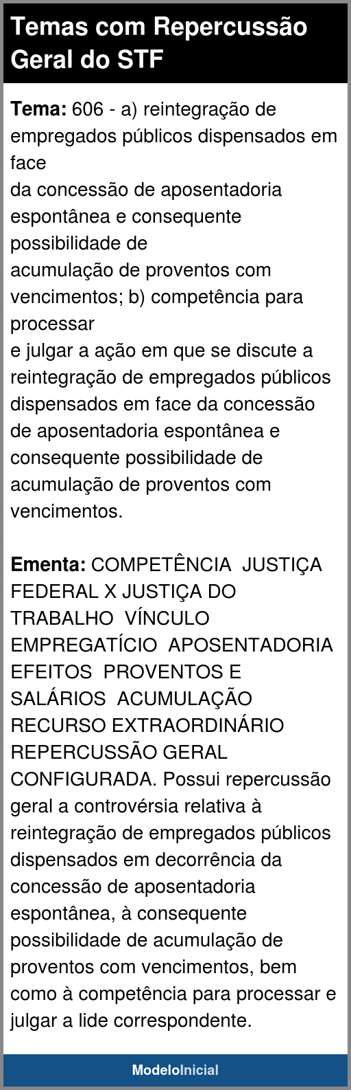 Tema 606: a) reintegração de empregados públicos dispensados em face da concessão de aposentadoria espontânea e consequente possibilidade de acumulação de proventos com vencimentos; b) competência para processar e julgar a ação em que se discute a reintegração de empregados públicos dispensados em face da concessão de aposentadoria espontânea e consequente possibilidade de acumulação de proventos com vencimentosDescrição: Recurso extraordinário em que se discute, à luz do inciso XXXVI do art. 5º; do caput, dos incisos I, II, XVI e XVII e do § 10 do art. 37; do § 6º do art. 40; do art. 41; do art. 114; bem como do § 1º do art. 173, todos da Constituição Federal, a possibilidade, ou não, da reintegração de empregados públicos dispensados em face da concessão de aposentadoria espontânea e da consequente possibilidade de acumulação de proventos com vencimentos; assim como a competência para processar e julgar a respectiva causa (se da Justiça Federal ou da Justiça do Trabalho).