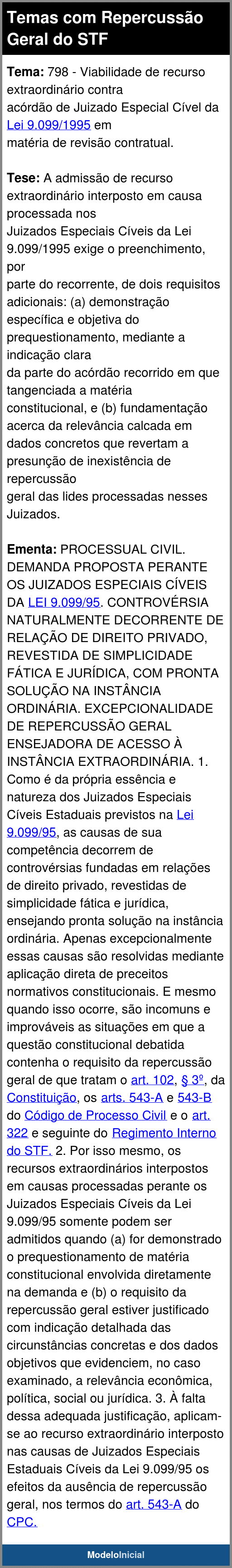 Tese: A admissão de recurso extraordinário interposto em causa processada nos Juizados Especiais Cíveis da Lei 9.099/1995 exige o preenchimento, por parte do recorrente, de dois requisitos adicionais: (a) demonstração específica e objetiva do prequestionamento, mediante a indicação clara da parte do acórdão recorrido em que tangenciada a matéria constitucional, e (b) fundamentação acerca da relevância calcada em dados concretos que revertam a presunção de inexistência de repercussão geral das lides processadas nesses Juizados. Obs.: unificação da tese para os Temas 797, 798 e 800.
