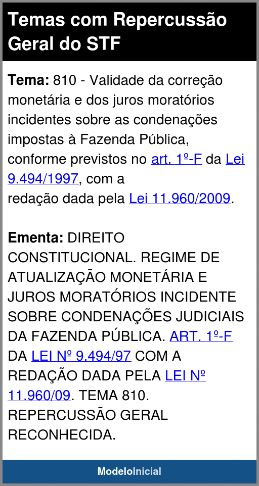 Repercussão Geral: Tema 810/STF - Validade da correção monetária e dos juros moratórios incidentes sobre as condenações impostas à Fazenda Pública, conforme previstos no art. 1º-F da Lei 9.494/1997, com a redação dada pela Lei 11.960/2009.
