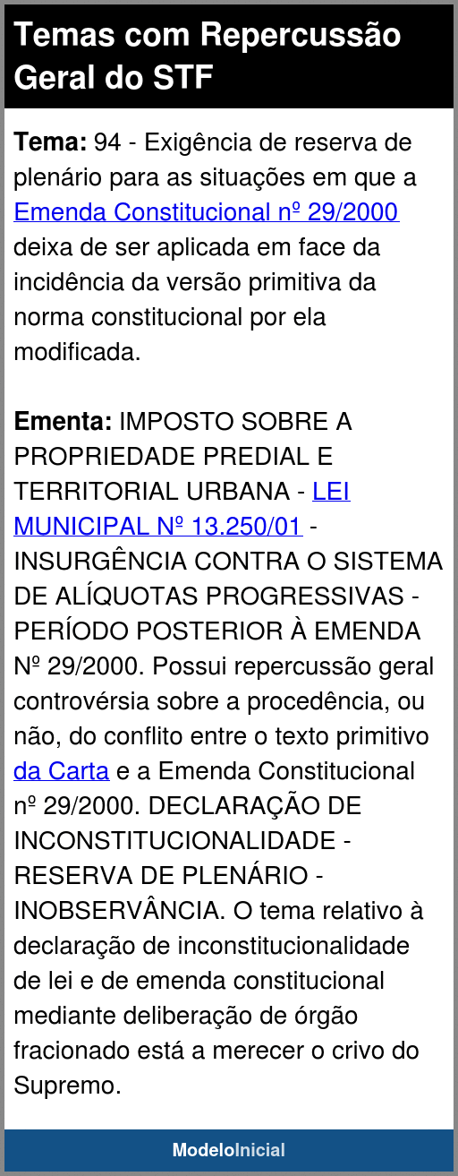 Tema 94: Exigência de reserva de plenário para as situações em que a Emenda Constitucional nº 29/2000 deixa de ser aplicada em face da incidência da versão primitiva da norma constitucional por ela modificada.Descrição: Recurso extraordinário em que se discute, à luz dos artigos 97; 156, § 1º, I e II, da Constituição Federal, a nulidade, ou não, de acórdão proferido pela Corte de origem, que reconheceu a inconstitucionalidade da Emenda Constitucional nº 29/2000, sem a manifestação do Órgão Especial, e a procedência, ou não, do conflito entre o texto primitivo da Constituição Federal e a referida Emenda Constitucional nº 29/2000.