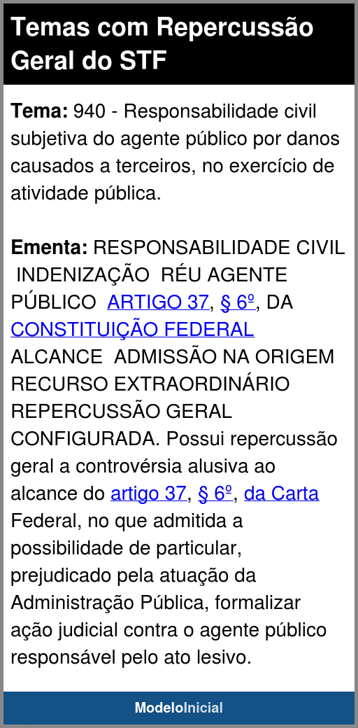 Tema 940: Responsabilidade civil subjetiva do agente público por danos causados a terceiros, no exercício de atividade pública.Descrição: Recurso extraordinário no qual se discute, com base no art. 37, § 6º, da Constituição da República, a possibilidade de particular, prejudicado pela atuação da Administração Pública, formalizar ação judicial diretamente contra o agente público responsável pelo ato lesivo.