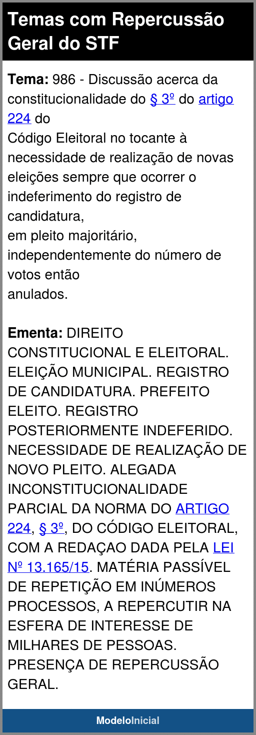 Tema 986: Discussão acerca da constitucionalidade do § 3º do artigo 224 do Código Eleitoral no tocante à necessidade de realização de novas eleições sempre que ocorrer o indeferimento do registro de candidatura, em pleito majoritário, independentemente do número de votos então anulados.Descrição: Recurso extraordinário em que se discute, à luz dos arts. 1º, inc. I e parágrafo único, 5º, inc. LIV e 14, caput e § 9º, da Constituição da República, a inconstitucionalidade parcial do § 3º do artigo 224 do Código Eleitoral, no que determina a realização automática de novas eleições sempre que ocorrer o indeferimento do registro de candidatura, em pleito majoritário, independentemente do número de votos então anulados.