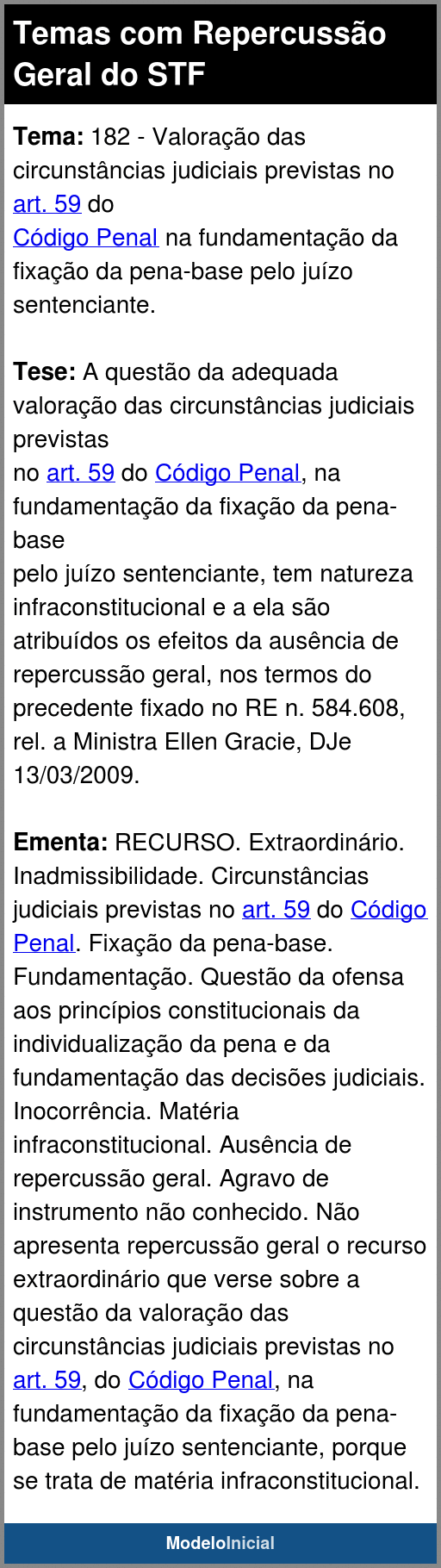 Tema 182: Valoração das circunstâncias judiciais previstas no art. 59 do Código Penal na fundamentação da fixação da pena-base pelo juízo sentenciante.Descrição: Agravo de instrumento interposto contra decisão que inadmitiu recurso extraordinário em que se discute, à luz dos artigos 5°, XLVI, e 93, IX, da Constituição Federal, a adequação, ou não, de valoração das circunstâncias judiciais previstas no art. 59 do Código Penal na fundamentação da fixação da pena-base pelo juízo sentenciante.