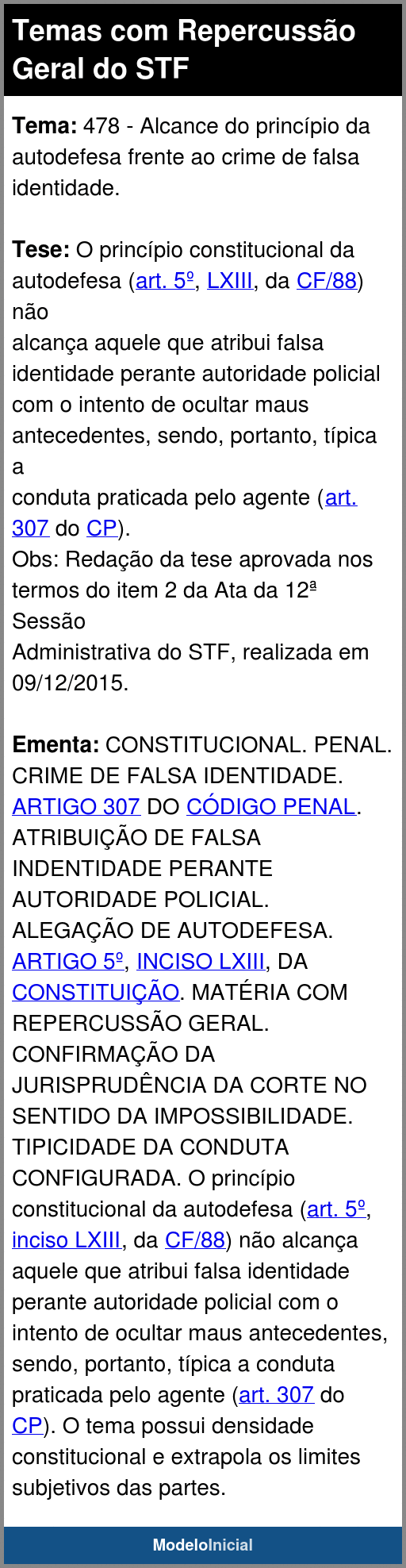 Repercussão Geral: Tema 478/STF - Alcance do princípio da autodefesa frente ao crime de falsa identidade