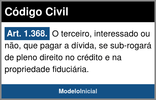Art. 1.368. O terceiro, interessado ou não, que pagar a dívida, se sub-rogará de pleno direito no crédito e na propriedade fiduciária.