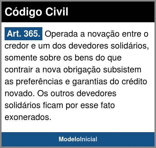 Art. 365. Operada a novação entre o credor e um dos devedores solidários, somente sobre os bens do que contrair a nova obrigação subsistem as preferências e garantias do crédito novado. Os outros devedores solidários ficam por esse fato exonerados.