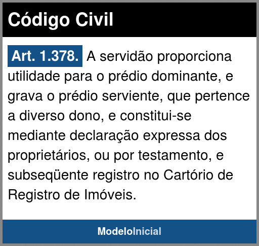 Art. 1.378. A servidão proporciona utilidade para o prédio dominante, e grava o prédio serviente, que pertence a diverso dono, e constitui-se mediante declaração expressa dos proprietários, ou por testamento, e subseqüente registro no Cartório de Registro de Imóveis.