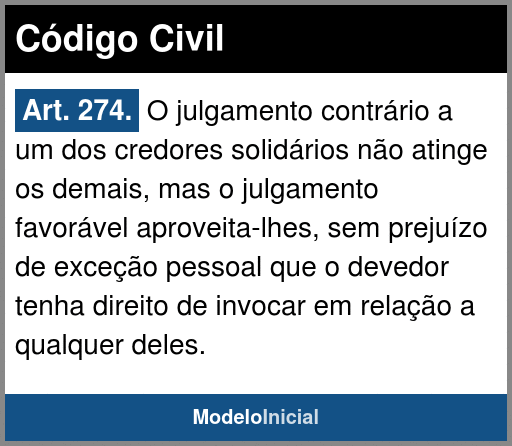 Art. 274. O julgamento contrário a um dos credores solidários não atinge os demais, mas o julgamento favorável aproveita-lhes, sem prejuízo de exceção pessoal que o devedor tenha direito de invocar em relação a qualquer deles.
