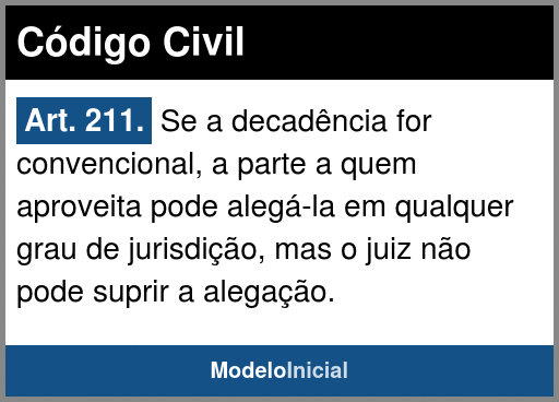 Art. 211. Se a decadência for convencional, a parte a quem aproveita pode alegá-la em qualquer grau de jurisdição, mas o juiz não pode suprir a alegação.