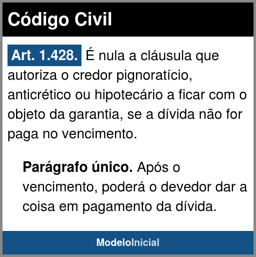 Art. 1.428. É nula a cláusula que autoriza o credor pignoratício, anticrético ou hipotecário a ficar com o objeto da garantia, se a dívida não for paga no vencimento.