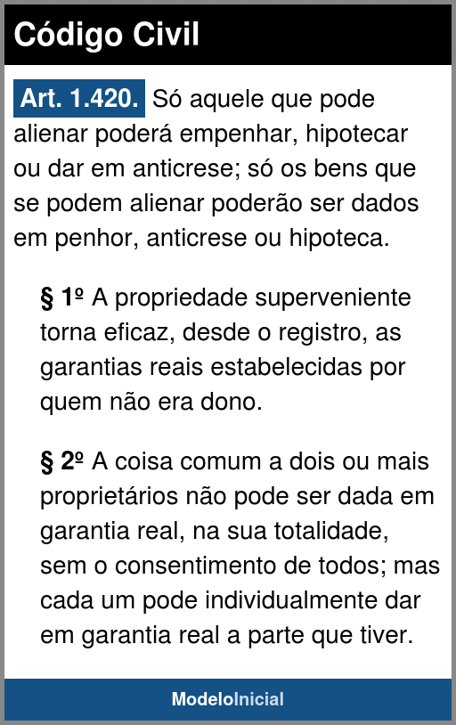 Art. 1.420. Só aquele que pode alienar poderá empenhar, hipotecar ou dar em anticrese; só os bens que se podem alienar poderão ser dados em penhor, anticrese ou hipoteca.
