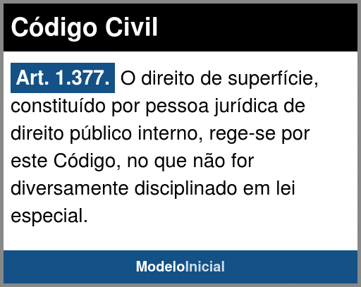 Art. 1.377. O direito de superfície, constituído por pessoa jurídica de direito público interno, rege-se por este Código, no que não for diversamente disciplinado em lei especial.