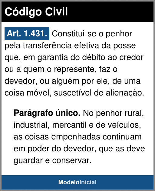 Art. 1.431. Constitui-se o penhor pela transferência efetiva da posse que, em garantia do débito ao credor ou a quem o represente, faz o devedor, ou alguém por ele, de uma coisa móvel, suscetível de alienação.