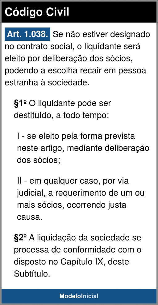 Art. 1.038. Se não estiver designado no contrato social, o liquidante será eleito por deliberação dos sócios, podendo a escolha recair em pessoa estranha à sociedade.