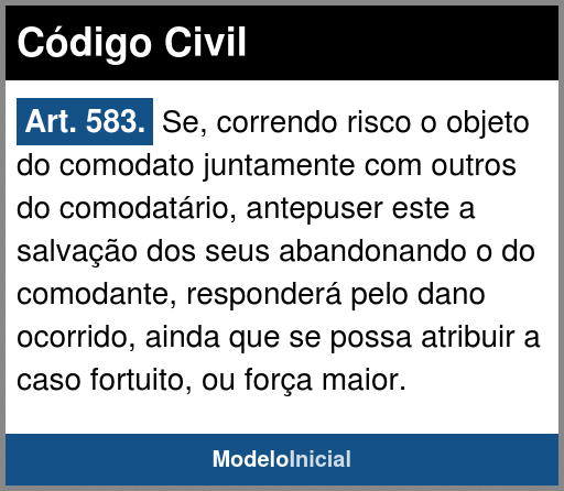 Art. 583. Se, correndo risco o objeto do comodato juntamente com outros do comodatário, antepuser este a salvação dos seus abandonando o do comodante, responderá pelo dano ocorrido, ainda que se possa atribuir a caso fortuito, ou força maior.