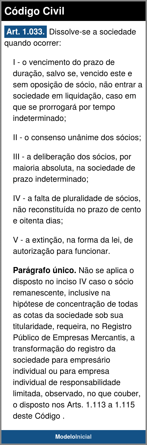 Código Civil - "Art. 1.033. Dissolve-se a sociedade quando ocorrer: I - o vencimento do prazo de duração, salvo se, vencido este e sem oposição de sócio, não entrar a sociedade em liquidação, caso em que se prorrogará por tempo indeterminado; II - o consenso unânime dos sócios; III - a deliberação dos sócios, por maioria absoluta, na sociedade de prazo indeterminado; V - a extinção, na forma da lei, de autorização para funcionar."